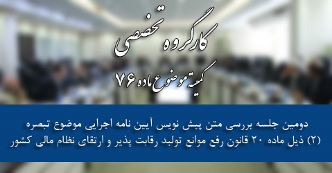 به منظور بررسی متن پیش نویس آیین نامه اجرایی موضوع تبصره (2) ذیل ماده 20 قانون رفع موانع تولید رقابت پذیر و ارتقای نظام مالی کشور مصوب 1394، دومین جلسه کارشناسی در تاریخ 1394/4/13 با حضور نمایندگانی از سوی اتاق تعاون ایران، اتاق اصناف ایران، انجمن مدیران صنایع، انجمن سنگ آهن ایران و انجمن صنایع نساجی ایران توسط دبیرخانه کمیته موضوع ماده 76 قانون برنامه پنجم توسعه برگزار شد.